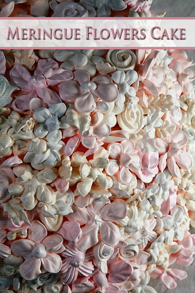 The flowers were made from around 7 different shades of white, ivory, silver, and pink. Rather than being a load of frosting flowers all over this cake.. it was frosted with brown sugar Swiss meringue buttercream, then covered in these crispy meringues!